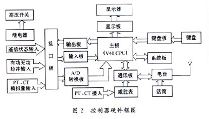該終端控制器的硬件結(jié)構(gòu)如圖2所示,它的主體是一臺STD工控機,采用模板式結(jié)構(gòu),便于故障檢修。供電線路的電壓、電流經(jīng)PT、CT變換后經(jīng)A/D轉(zhuǎn)換板轉(zhuǎn)變?yōu)閿?shù)字信號送至V40主板,PT、CT變比經(jīng)主臺設定后下發(fā)至該終端,CPU據(jù)此計算出線路的實際電壓、電流。脈沖電度表發(fā)出的脈沖信號經(jīng)輸入板送至CPU,根據(jù)電表脈沖常數(shù)計算出有功及無功功率。KG105型電臺接收主臺下發(fā)的指令,經(jīng)通訊板送至CPU,然后由輸出板控制輸出繼電器的動作,進而實現(xiàn)遙控跳合閘操作。遠程抄表是由電臺經(jīng)通訊板采集威勝表中的數(shù)據(jù)實現(xiàn)的,而召測數(shù)據(jù)則是采集CPU中計算出的數(shù)據(jù)。CPU每隔1min采集1次數(shù)據(jù),所有計算結(jié)果保存在系統(tǒng)板上的SRAM中,可保存24小時的數(shù)據(jù),因此主臺第二天必須將第一天的數(shù)據(jù)召測回中心站的數(shù)據(jù)庫中,否則第一天的數(shù)據(jù)將丟失。