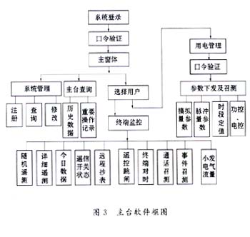 該無線電力負荷控制系統(tǒng)的管理軟件是用面向?qū)ο蟮木幊坦ぞ遃isualBasic6.0開發(fā)完成的,系統(tǒng)軟件框圖如圖3所示。系統(tǒng)啟動后要求輸入操作員工號及口令,驗證無誤后連接電臺,進入主窗體。