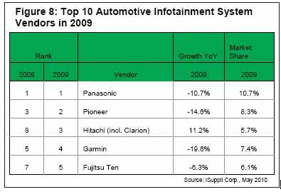 另一家日本一線供應商日立2009年排名第三。該公司2008年排名第八,是2009年10大廠商中營業(yè)收入增長的兩家廠商之一。日立2007年與Clarion Co. Ltd.合并,合并營業(yè)收入2009年占全球信息娛樂市場的5.7%。