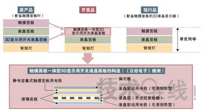 夏普的開發(fā)品將用于顯示3D映像的“開關(guān)液晶面板”與觸摸面板合為一體。該公司稱,通過這種方法,實現(xiàn)了與正面配備觸摸面板的現(xiàn)有2D液晶面板同等的厚度。(圖:上半部分根據(jù)夏普的資料制成,下半部分由《日經(jīng)電子》根據(jù)采訪內(nèi)容制成)