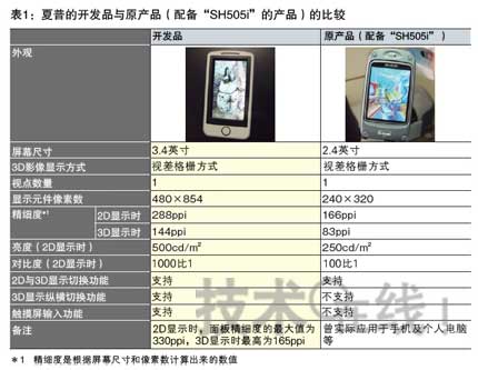 此次為了實現(xiàn)量產(chǎn),夏普進行了以下改進:①提高了顯示性能;②實現(xiàn)了薄型化。①顯示性能方面,分別將影像顯示用液晶面板的精細度和亮度提高到了原來的兩倍(表1)。因此,即使進行3D顯示,最大精細度也可達到165ppi。據(jù)介紹,這是通過驅(qū)動元件(TFT)的微細化實現(xiàn)的。該公司稱,還通過提高兩張面板的粘合精度,減輕了左眼用和右眼用影像重疊的“串?dāng)_(Crosstalk)”現(xiàn)象。