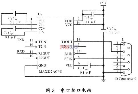 RS232標(biāo)準(zhǔn)是美國(guó)電子工業(yè)聯(lián)合會(huì)(EIA)制定的一種串行物理接口標(biāo)準(zhǔn),它適合于數(shù)據(jù)傳輸率在O~20000b/s范圍內(nèi)的通信,目前廣泛用于計(jì)算機(jī)與終端或外設(shè)之間的近端連接。實(shí)際工作時(shí),應(yīng)保證電平在5~15V之間。所以為了與單片機(jī)進(jìn)行通信。必須對(duì)其電平進(jìn)行轉(zhuǎn)換。現(xiàn)在常用的轉(zhuǎn)換芯片是MAX232。MAX232內(nèi)部有電壓倍增電路和轉(zhuǎn)換電路,只需5V電源便可實(shí)現(xiàn)TTL電平與RS232電平的轉(zhuǎn)換,使用十分方便。串口接口電路如圖3所示。