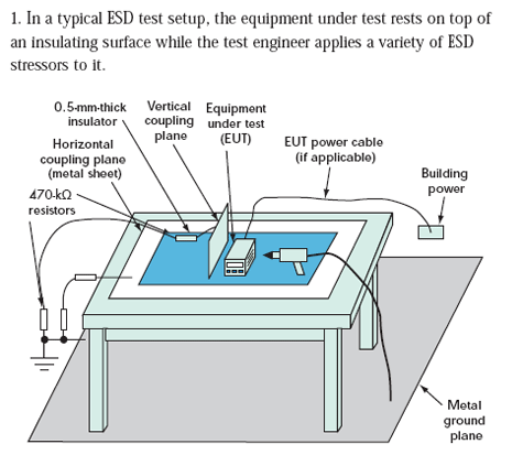這樣的測(cè)試環(huán)境必然能實(shí)現(xiàn)可重復(fù)的結(jié)果。首先,將被測(cè)設(shè)備(EUT)放在絕緣表面上,然后從不同的方向?qū)UT施加沖擊。例如,給導(dǎo)電表面施加接觸放電,這些表面包括所有金屬外殼和連接器的接地金屬殼。也可以向四周絕緣表面進(jìn)行空氣放電,并將重點(diǎn)放在可能的ESD路徑上,比如設(shè)備外殼中的縫隙以及所有通風(fēng)孔及鍵盤。