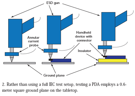 對(duì)于小型產(chǎn)品來(lái)說(shuō),工程師經(jīng)常在專門的測(cè)試環(huán)境中執(zhí)行系統(tǒng)級(jí)ESD測(cè)試(圖1)。對(duì)IEC61000-4-2測(cè)試而言,這些測(cè)試環(huán)境包括:地板上的金屬接地板、木桌、放在桌子上的金屬水平耦合板(到接地板有個(gè)0.95米長(zhǎng)的連線,在水平耦合板之上的一個(gè)0.5mm絕緣層)。