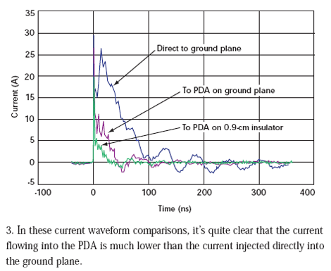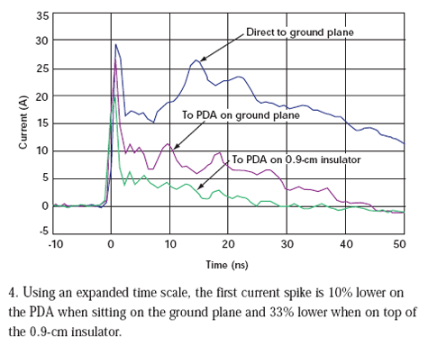但是,我們見到的電流減小前后并不一致。當(dāng)PDA直接放在接地板上時(shí),初始電流尖峰降低了10%。當(dāng)PDA放在0.9cm絕緣層上時(shí),初始電流尖峰減低33%(圖4)。在20ns點(diǎn),直接放在接地板上的PDA受到的沖擊要小69%,而位于絕緣層上的PDA受到的沖擊要小93%。電流減少是在沖擊狀態(tài)下給PDA充電的結(jié)果。在每次沖擊測(cè)試過(guò)程結(jié)束后,我們必須將PDA接地使它回到未充電狀態(tài)才能進(jìn)行下次測(cè)量。