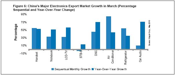 圖6所示為3月份中國主要電子產(chǎn)品的出口增長情況。