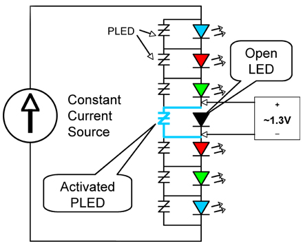 PLED設(shè)計(jì)是一種電壓觸髮型電子分路裝置,當(dāng)某個(gè)LED出現(xiàn)開(kāi)路故障時(shí),該裝置能夠提供電流旁路。當(dāng)某個(gè)LED故障時(shí),該設(shè)計(jì)可避免整個(gè)LED燈串都無(wú)法正常工作的情況。