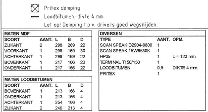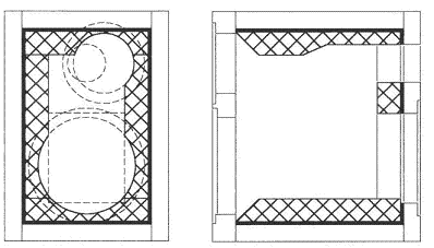 為了避免箱體共振,對兩側(cè)箱板和上、下面板使用22mm厚的中密度纖維板(MDF),前面板則使用30mm厚的MDF。6塊箱板的內(nèi)表面最好全部貼上4mm厚的鉛皮(但較貴),也可貼上相同厚度的瀝青油毛氈進行聲阻尼。在箱板開口處應(yīng)仔細地將阻尼材料剪掉,以免妨礙驅(qū)動單元和出聲管的安裝。