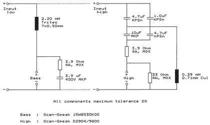 本音箱的無源分頻濾波器為兩個驅(qū)動單元分別提供相應(yīng)的高、低音頻段,它經(jīng)過仔細設(shè)計使驅(qū)動單元的特性與箱體達到匹配,制作時不要輕易改變?yōu)V波器電路和驅(qū)動單元。