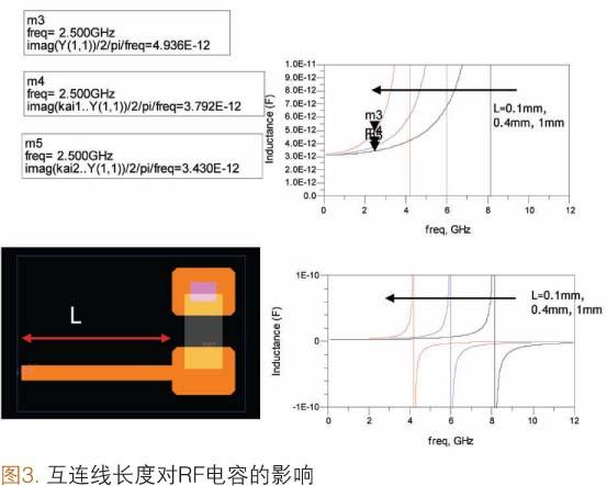 圖3是RF頻段下單個SMD焊盤的互連線長度對電容影響的簡單實(shí)例。在這種情況下,3.0pFSMD電容的一個電極連接在M2層上,形成接地電容。100.0μm寬的互連線與另一個電極連接在一起。在2.5GHz頻段下,1.0mm長的互連線可使SMD電容器的等效電容增長到4.9pF(增大了63%)。當(dāng)然,互連線越短,等效電容與本征電容(3.0pF)的值就越接近。然而,通常使用長互連線連接SMD元件是不可避免的。在這種情況下,考慮互連線對電容的影響就顯得異常重要(有時把這種方法稱為對電容的微調(diào)),否則SiP將無法正常工作。