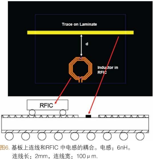 為了對主時鐘線和RF元件之間的相互作用進(jìn)行分析,把壓控振蕩器(VCO)中使用的RF電感(6.0nH)放置在穿通多層襯底的時鐘互連線附近(圖6)。我們在這個研究中使用的互連線長為2.0mm。當(dāng)VCO電感和互連線之間的橫向距離(d)大于0.5mm時,產(chǎn)生的耦合信號將小于-80.0dB。耦合信號的實(shí)際要求由SiP系統(tǒng)級電設(shè)計(jì)決定。