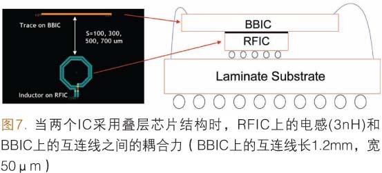 圖7給出了BBIC和RFIC采用SiP(為簡單起見,實(shí)例中未表示SMD元件)疊層芯片結(jié)構(gòu)的實(shí)例。在這個實(shí)例中未使用金屬屏蔽層,使用環(huán)氧芯片粘接材料把BBIC直接堆疊在RFIC上。就像前文提到的那樣,BBIC中的主時鐘信號(20.0MHz或40.0MHz)包含一些高頻成分,落在RF芯片通帶的范圍內(nèi)。如果BBIC中時鐘互連線和RF芯片之間沒有保持足夠的隔離,特別是在VCO電感中,主時鐘信號可能使RF電路產(chǎn)生噪聲,降低RF芯片的選擇性。