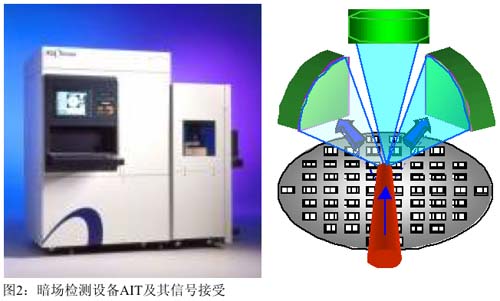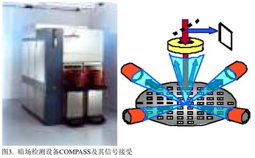 暗場(chǎng)檢測(cè)技術(shù)作為檢測(cè)晶片缺陷的有效手段之一,其優(yōu)點(diǎn)在于以下幾個(gè)方面:首先,在暗場(chǎng)獲得圖像的灰階易于控制和調(diào)節(jié)。暗場(chǎng)是位于硅片上方和硅片成30度角的區(qū)域,在此區(qū)域內(nèi)獲得的圖像灰階,可以通過(guò)調(diào)節(jié)激光的能量和探測(cè)器的敏感度來(lái)輕松控制;其次,在暗場(chǎng)內(nèi),可以很容易地辨認(rèn)有具體形態(tài)和位于硅片表面的缺陷,比如刮傷、微粒之類的缺陷;最后,使用暗場(chǎng)的檢測(cè)速度非???,成本相對(duì)比較低,通常被用作快速分析影響產(chǎn)量的各類缺陷超出界定值的問(wèn)題,AIT和COMPASS是在半導(dǎo)體制造企業(yè)廣泛應(yīng)用的暗場(chǎng)檢測(cè)設(shè)備(如圖2和3所示)。[page]
