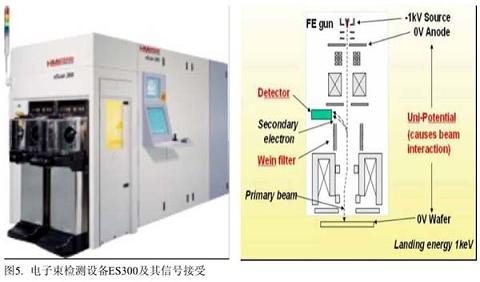 首先,它擺脫了照明光源,檢測(cè)結(jié)果不會(huì)受到類似變色、厚度不均等各種層面所帶來(lái)的物理因素的影響;其次,電子束的分辨率極高。因?yàn)樗臋z測(cè)單位是電子,電子要比微波以及任何尺寸的顆?;蛉毕荻家〉枚啵辉俅?,電子是帶有電性的電荷,所以它可以被用于分析材料的電性或電組織成分,這被稱作電壓對(duì)比度圖像,經(jīng)常被用于檢測(cè)類似開(kāi)閉鎖等電子電路缺陷和通孔蝕刻不足等材料缺陷。電子束檢測(cè)設(shè)備一般有KLA-Tencor和HMI公司的Escan系列(如圖5所示)。