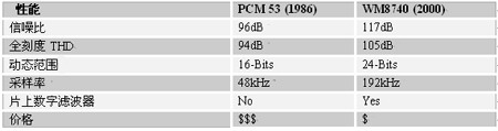 在過去的15年里,ADC和DAC系統(tǒng)的性能一直在穩(wěn)定地增長。下面的音頻DAC表簡要列出了今天最先進的DAC和1986年最先進的DAC之間的性能比較。現(xiàn)在,將廣泛的數(shù)字濾波技術(shù)集成進今天的DAC轉(zhuǎn)換器中不僅在技術(shù)上是可行的,而且也非常經(jīng)濟。如WolfsonMicroelectronics公司的DAC器件WM8740具有完全支持最新DVD-Audio標準、CD和其它使用PCM格式數(shù)據(jù)的數(shù)字音頻系統(tǒng)的架構(gòu)。