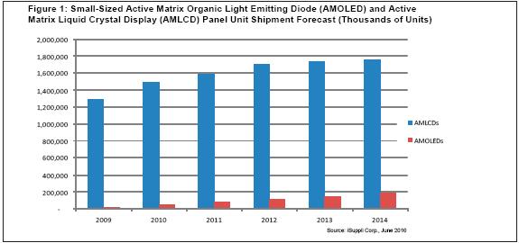 圖1所示為iSuppli公司對2009-2014年小尺寸AMLCD和AMOLED的出貨量預(yù)測。iSuppli公司對小尺寸顯示器的定義是:對角尺寸小于等于9英寸的顯示器。