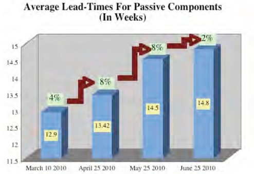 根據(jù)Paumanok Publications, Inc公司調(diào)查顯示,上月被動(dòng)元件交貨期平均每45天就延長4%(被動(dòng)元件交貨期繼續(xù)延長 供應(yīng)鏈持續(xù)緊張),最近一次調(diào)查則顯示,截止6月25日被動(dòng)元件交貨期和上月相比再次提升2%,平均交貨期為14.8周。下圖為3月至6月25日的被動(dòng)元件交貨期情況。