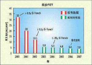 圖2所示的是同步或稱低端(low-side)FET的品質(zhì)因數(shù)。在這里,實際上是傳導損耗主宰了處在導通電阻時域的品質(zhì)因數(shù)。僅在過去的兩年中,通過將1至2微米溝道技術升級為深亞微米水平,就使品質(zhì)因數(shù)提高了約3倍,今后還有更多的改進余地。