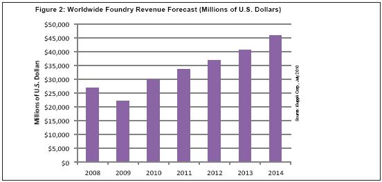 到2014年,總體純晶圓代工產(chǎn)業(yè)的營(yíng)業(yè)收入將從2008年的268億美元上升到459億美元,復(fù)合年度增長(zhǎng)率為9.4%。