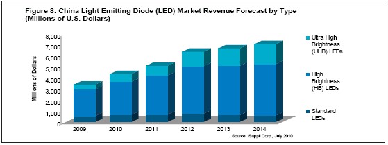 另外,憑借政府的支持和LED日益進(jìn)入液晶電視及普通照明等新的應(yīng)用領(lǐng)域,iSuppli公司預(yù)測(cè),2014年中國(guó)LED營(yíng)業(yè)收入將達(dá)到71億美元,而2009年是34億美元,其間的復(fù)合年度增長(zhǎng)率為12.8%。超高亮度(UHB)LED的增長(zhǎng)速度更快,到2014年銷售額將從2010年的6.86億美元上升到18億美元,復(fù)合年度增長(zhǎng)率為26.9%。