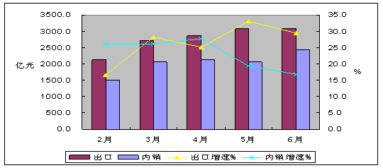 五、內(nèi)外銷保持同步增長,出口繼續(xù)快于內(nèi)銷。今年以來,隨著外需不斷回暖,外銷出現(xiàn)持續(xù)增長,到5月底,全行業(yè)累計(jì)外銷增速開始超過內(nèi)銷,進(jìn)入6月份,外銷增速優(yōu)勢(shì)進(jìn)一步加強(qiáng),超過內(nèi)銷增速4個(gè)百分點(diǎn)。其中,內(nèi)銷產(chǎn)值11975.5億元,同比增長27.2%;出口交貨值16647.1億元,同比增長31.2%,高于產(chǎn)業(yè)平均增速1.7個(gè)百分點(diǎn)。產(chǎn)業(yè)出口依存度(58.1%)比去年同期提高0.7個(gè)百分點(diǎn),比前5個(gè)月下降0.6個(gè)百分點(diǎn)。