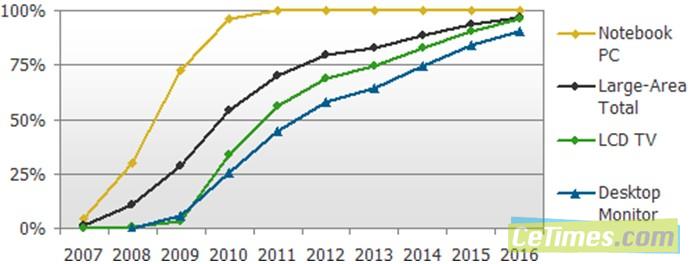 - 2012年第四季大尺寸LED背光源液晶面板滲透率將達80%