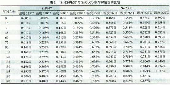 一些其它值得注意的現(xiàn)象包括:對于初始銅含量大約為O.3%的未經(jīng)使用的SnCuCo,與銅含量為0的新啟用的SnPb37相比較,在經(jīng)歷各種溫度狀態(tài)下的研究后發(fā)現(xiàn),銅溶解的速度顯得相當?shù)穆?br /> [page]
