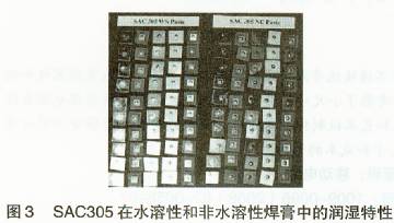 圖3顯示了SAC305水溶性和非水溶性焊劑在同樣的電路板表面涂覆處理情況下所反映出來的潤濕特性。同樣,浸銀處理后形成了最差的潤濕效果,隨后是OSP、ENIG和浸錫。經(jīng)熱風整平技術表面處理的樣品在兩種情況下都顯示出具有較大的潤濕面積。[page]