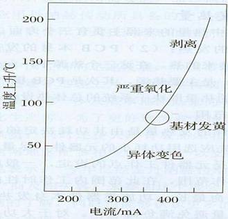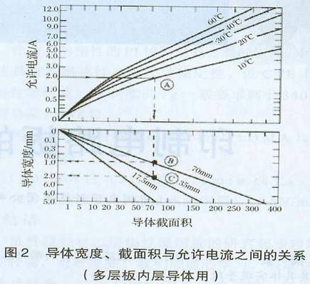 值得注意的是,當導體圖形溫度上升到85℃左右時,絕緣材料自身開始發(fā)黃(圖1),電流繼續(xù)通過,最后銅圖形熔斷,特別是多層板內(nèi)層圖形,周圍都是傳熱性差的樹脂,散熱困難,因而溫度不可避免地上升,所以特別要注意導體圖形線寬的設(shè)計。實際上在進行PCB布線設(shè)計時走線線寬主要依據(jù)其發(fā)熱量和散熱環(huán)境來確定的。銅導體的截面積決定了導線電阻(數(shù)字電路中線電阻引起的信號損耗可忽略不計),銅導體和絕緣基材的導熱率影響溫升,進而決定載流量。圖2是普通FR-4覆銅箔板銅導體圖形線寬及截面積與允許電流之間的關(guān)系圖。從圖中可以看出:導體圖形截面積一定,當其允許電流值為2A,溫度上升值低于10℃時,對于35Um銅箔,其線寬應(yīng)設(shè)計為2mm:對于70um銅箔,其線寬應(yīng)設(shè)計為lmm。由此得出:當導體的截面積、允許電流和溫度上升值一定時,可通過增加銅箔厚度或加大線寬值兩個方面來滿足走線的散熱要求。