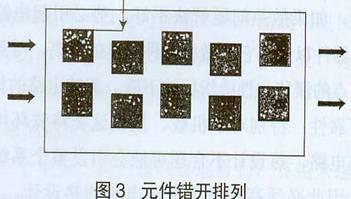 交錯分散排列。在布板設(shè)計進行元件布局時,應(yīng)將發(fā)熱元器件與一般器件及溫度敏感器件區(qū)分開,發(fā)熱器件周圍應(yīng)留有足夠的散熱氣體流動通道,發(fā)熱元件應(yīng)錯開分散排列,如圖3所示。這與通常布局時的整齊劃一排列恰好相反,有利于改善散熱效果。[page]