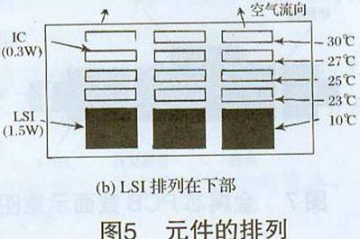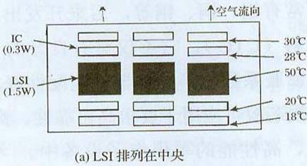 熱性能相同發(fā)熱元器件布置:圖5顯示PCB上安裝IC(0.3W),LSI(1.5W)時溫度上升的實測值。按圖5(a)排列,IC的溫度上升值是18℃-30℃,LSI溫度上升值是50℃。按圖5(b)排列,LSI溫度上升值是40℃,比圖5(a)排列還要低10℃。