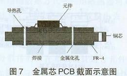 金屬板嵌入多層印制板的中間,其典型結(jié)構(gòu)如圖7金屬芯板本身也可作為地層使用,其上下層可通過金屬化孔(與芯板絕緣)互聯(lián),并通過導熱孔實現(xiàn)熱量在金屬芯板內(nèi)層和表面的傳遞。如圖7所示,發(fā)熱元件可通過底部和導熱孔直接焊接在板面上,發(fā)熱器件產(chǎn)生的熱直接傳遞到金屬芯板,由金屬芯板經(jīng)導熱孔傳給接觸的安裝機箱而散發(fā)出去;熱量較大時可銑去芯板兩邊的絕緣層,通過邊緣裸露的金屬芯板與機座接觸散熱,因此具有良好的散熱效果。對處于密閉機箱中的電路散熱是一種較好的選擇金屬芯PCB的芯材通常有鋁、銅、鋼等,后來開發(fā)出了覆銅因瓦復合材料(CIC),它不僅具有良好的導熱性,而且其熱膨脹系數(shù)與半導體器件匹配性好,所制成的CIC金屬芯板可應(yīng)用于要求高可靠性、高組裝密度、高功率、高性能的軍用電子設(shè)備中。