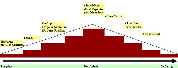鋁電容器技術(shù)路線圖已經(jīng)發(fā)展到一個節(jié)點上,在此新投資聚集在鋁固體聚合物元件,以及作為替代技術(shù)的碳和鈮介質(zhì)開發(fā)上。更完善的產(chǎn)品,如單元安裝電容器(snap-mount)、閃光電容器(flash capacitor),和馬達啟動鋁電容器(motor start aluminum capacitors)已收到有限的投資,但繼續(xù)服務(wù)于更小的、增值的電容細分市場。老產(chǎn)品用于新技術(shù)研發(fā)所獲得的資金支持會更少,包括標(biāo)準(zhǔn)的徑向引線鋁電容器和軸向鋁電容器。例如,軸向引線鋁電容器,近些年來已經(jīng)很少受到關(guān)注,但是他們現(xiàn)在作為一個傳統(tǒng)產(chǎn)品,在國防和汽車應(yīng)用方面仍然保有市場。當(dāng)用于上述圖表中列舉的所有主要產(chǎn)品的投資,在過去20年中獲得了不同程度的回報之時,市場已經(jīng)轉(zhuǎn)向鋁固體聚合物電容設(shè)計,行業(yè)中的主要供應(yīng)商正在調(diào)整自己的定位以把握巨大的市場機會。而且,在一些不同用途的關(guān)鍵細分市場上,如醫(yī)療電子,石油和天然氣勘探等領(lǐng)域,引入導(dǎo)電聚合物鋁技術(shù),也會帶來增值和在特定應(yīng)用市場的機會。