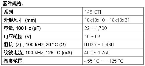 新款146 CTI電容器具有最苛刻的回流焊曲線,提供從10mmx10mmx10mm至更大的18mmx18mmx21mm的8種外形尺寸。今天發(fā)布的器件的高溫性能達(dá)+125℃,在100kHz和+20℃條件下的阻抗為0.035Ω~0.430Ω,在100kHz和+125℃條件下的紋波電流為400mA~1750mA,在+125℃下的使用壽命長達(dá)6000小時。