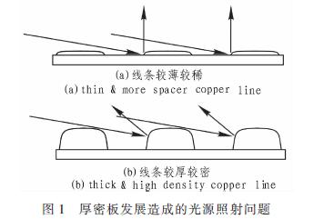 在PCB行業(yè)的發(fā)展中,目前存在以下3大趨勢,即線條更細、線距更小密度更高、高度差更加明顯。本文使用的厚密板即是該趨勢的集中體現(xiàn)。如圖l(a)是普通光源應用在線距大、厚度小的PCB上的光線路徑。圖1(b)是普通光源應用在線距小、厚度大的PCB上的光線路徑。