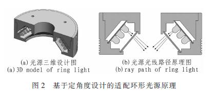 通過前面的分析可以看出,要想解決厚密板的光源照射問題,同時能夠保持精度的穩(wěn)定與提升。必須基于厚密板的幾何和光學特征,有效地解決入射角度選擇以及適合應用對象的環(huán)形光源參數(shù)配置,基于此,本文提出基于定角度設計的適配環(huán)形光源,其基本原理如圖2所示。