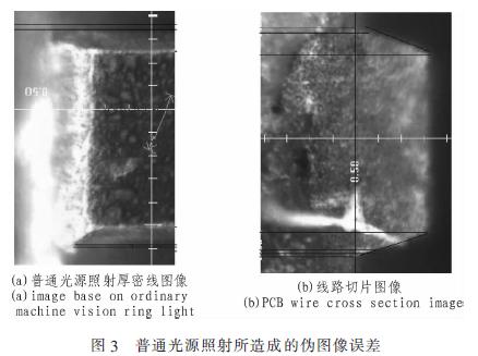 從圖中可以清晰地看到,目前的普通光源攝取的圖像和真實的截面圖有明顯的邊緣偏差,在2X的倍率下,1像素對應的物面尺寸為1.61μm。偽圖像邊緣造成的線寬差別超過3像素。使得系統(tǒng)準確度大為降低。該偽圖像邊緣產(chǎn)生的原因是由于普通光源光線照射角度過小。被厚密線路遮擋大部分光線后,基材和下線寬的亮度和顏色非常接近。而一般的線寬測試中,并沒有將該偏差計入測量結果。致使測量值產(chǎn)生一個固有方向的系統(tǒng)誤差,也就是說,如果該誤差不能被消除,所測得的數(shù)據(jù)不是真實PCB的線路特征的反映。而該誤差并不能通過改變圖像的清晰程度和對比度消除,只能依據(jù)PCB厚密線路的特點去改變光源的設計來消除或減小該誤差。