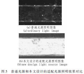 從圖5可以看出,使用普通光源僅僅能將上線寬附近的法線方向接近水平45°的線路照亮,如圖5(a)中兩根橫向亮線。由于厚密線路對光線的強烈遮擋作用,基材部分亮度非常低且接近下線寬亮度,肉跟幾乎不可分辨其差別。而由于線路表面的反射接近鏡面反射,導致到達線路表面的光線不能進入鏡頭的收光光錐,上線寬以內(nèi)亮度也非常低。圖像沒有將PCB線路信息有效記錄,分析下線寬的精度很低且上線寬有固定系統(tǒng)誤差。而使用本文設計的適配光源的圖像,均勻度和清晰度良好。由于光源角度經(jīng)過仔細考慮,使得基材/線路過渡/線路表面的亮度呈現(xiàn)出階梯式上升且不同特征之間過渡區(qū)域小,有利于提高測試精度,實現(xiàn)對所關注線路的照明及信息提取。對于圖像處理來說是非常理想的源圖像。