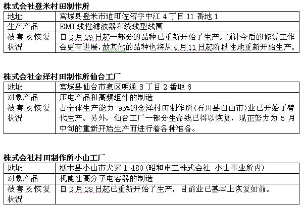 在之前,本網(wǎng)站曾報道過,截至23日18時,日本東部大地震對日本村田制作所位于宮城縣和櫪木縣的三個受災工廠的破壞程度。今天日本村田制作所再次發(fā)表聲明,告知三個受災工廠的恢復程度。