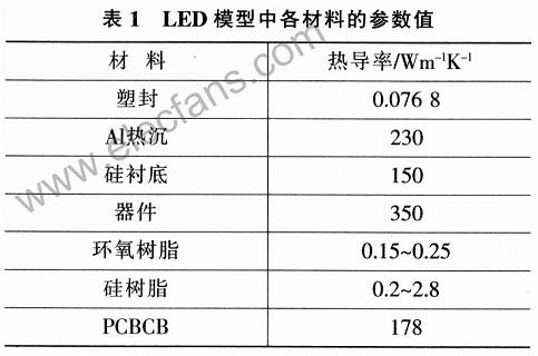 討論在現(xiàn)有結(jié)構(gòu)、LED封裝及熱沉材料熱導(dǎo)率等因素變化對于其最大功率的影響,尋找影響LED散熱的關(guān)鍵因素。研究方法為有限元熱分析法.該方法已有實驗驗證了LED有限元模型與其真實器件之間的差別,證明其在誤差許可范圍內(nèi)是準確可行的。