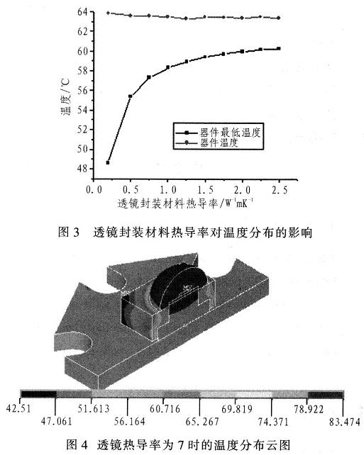 只考慮熱傳導(dǎo)與對流,改變不同封裝填充材料如硅樹脂.得出結(jié)果,如圖3所示。即使找到一種熱導(dǎo)率高達7Wm-1K-1的環(huán)氧樹脂成分封裝材料時,相比使用熱導(dǎo)率為0.25Wm-1K-1的環(huán)氧樹脂成分封裝材料時,芯片溫度下降不多,鋁基板溫度只下降了2.271℃,最大功率僅提高了0.69W。實際上,熱導(dǎo)率值超過7Wm-1K-1以上、可商業(yè)化的透明硅樹脂封裝材料目前尚無文獻報導(dǎo)。分布云圖如圖4所示。