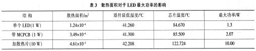 表3為3種不同散熱方式對LED的溫度分布、最大功率的影響。可以看出,增加散熱面積是很好的散熱方式,可以輕易地提高LED器件散熱能力,這是目前LED產(chǎn)品所普遍使用的散熱方式之一。然而缺點也很明顯:影響成本、增加產(chǎn)品重量、影響封裝密度。無限度地提高LED散熱片面積顯然不現(xiàn)實,因此一般使用1.5inch2散熱片提升LED產(chǎn)品最大功率至10W左右,出于成本等因素就不能繼續(xù)提高。