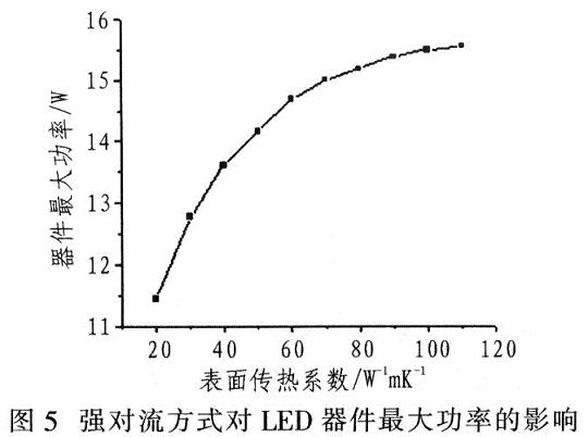 常見對流散熱方式有兩種:自然對流和強制對流。固定結(jié)構(gòu)的散熱與表面?zhèn)鳠嵯禂?shù)有關(guān)。空冷方式時,不同傳熱系數(shù)對最大功率的影響如圖5所示。強對流方式在一定速度內(nèi)會大大提高LED產(chǎn)品的散熱能力,有助于提高散熱效果。