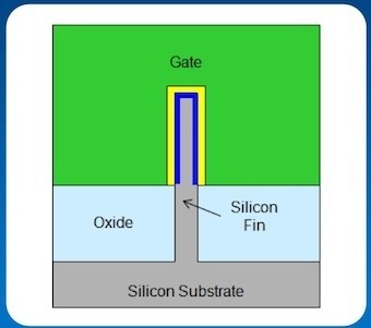 英特爾稱之為3D晶體管,但從技術(shù)上講,這是三門晶體管。傳統(tǒng)的二維門由較薄的三維硅鰭所取代,硅鰭由硅基垂直伸出。