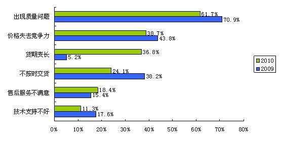 在缺貨的大環(huán)境下,不少電子系統(tǒng)制造商被迫更換供應商。導致合格供應商降級的最主要因素依次是物料出現質量問題、價格失去競爭力和貨期變長。物料質量問題在任何情況下都是不可妥協的;價格失去競爭力也就是價格上漲壓縮了下游公司的利潤空間;而貨期變長導致供應商降級的比例變化最顯著,由2009年的5.2%大幅上升至2010年的36.8%——這是供應鏈調整的表現。因此,系統(tǒng)廠商在考察新供應商時,除了考察物料質量因素外,產品性價比和供貨能力也是重要的考慮因素。