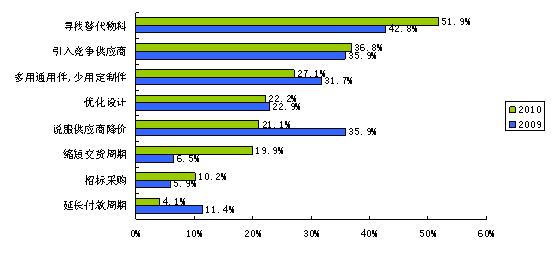 在缺貨漲價的氣氛中談COSTDOWN注定是個艱難的過程。調查中顯示,2010年最主要的COSTDOWN方式是尋找替代物料和引入競爭供應商。與2009年相比,尋找替代物料依然是最重要的COSTDOWN方式,但采取說服供應商降價這種方式的人少了許多,由35.9%降至21.1%,其中,2億營業(yè)額以上的大公司在砍價方面顯然更有話語權。
