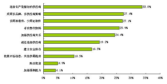 為了應對采購風險,采購商采取了綜合的應對措施,其中最主要的三種方式是:選擇生產資源好的供應商、采用多品牌多供應商策略、多用通用件少用定制件。不同營業(yè)規(guī)模和不同終端產品的公司也表現出各自不同的應對措施。更多詳細內容請關注電子元件技術網出版的《2011供應商管理調查報告》。