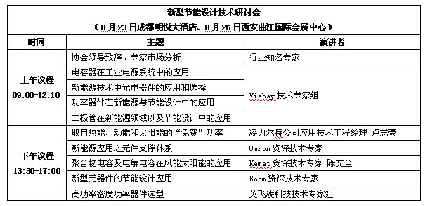 [page]新型節(jié)能設(shè)計技術(shù)研討會以風(fēng)能太陽能發(fā)電與節(jié)能設(shè)計為主題,圍繞智能電源、逆變器設(shè)計、智能控制、馬達控制、新型電子元器件與模塊的應(yīng)用展開探討,來自知名廠商的技術(shù)專家將分享逆變器設(shè)計、馬達控制、變頻技術(shù)、電力電子技術(shù)在風(fēng)能/太陽能、工業(yè)電子、通信設(shè)備、軍工上的應(yīng)用解決方案和節(jié)能設(shè)計技術(shù)。