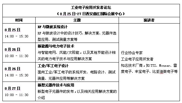 作為2011西部電子論壇中的一個新環(huán)節(jié),論壇組委會將聯(lián)合2011中國(西安)電子展,同期展會2號館推出工業(yè)電子應(yīng)用開發(fā)者論壇,該活動是2011中國(西安)電子展中的核心活動之一,聚焦以西安為中心的電子行業(yè)最為關(guān)注的RF微波、新能源以及工業(yè)應(yīng)用等主題,邀請研發(fā)一線的工程師與領(lǐng)先的技術(shù)廠商代表同臺展示設(shè)計新技術(shù)、新思路、新方案,為工業(yè)電子應(yīng)用開發(fā)者提供深入、平等交流的機會。