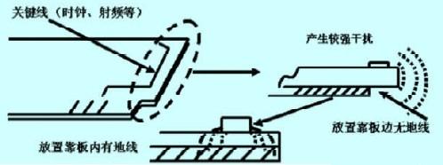 印制電路板的板邊處理是否合理, 決定著是否能夠更加有效地抑制信號的對外干擾。為防止高速數(shù)字電路通過板邊對外干擾, 應該嚴格控制其布線位置, 讓其盡量靠近印制板內(nèi)部。高頻等干擾較強信號線不應該走到板的邊緣, 以防止無對應地層耦合回路, 產(chǎn)生信號對外的干擾泄漏, 如圖3 所示: